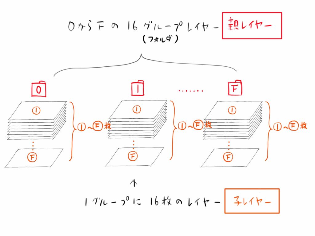 上のようなレイヤグループが0からFまでの16組あります。