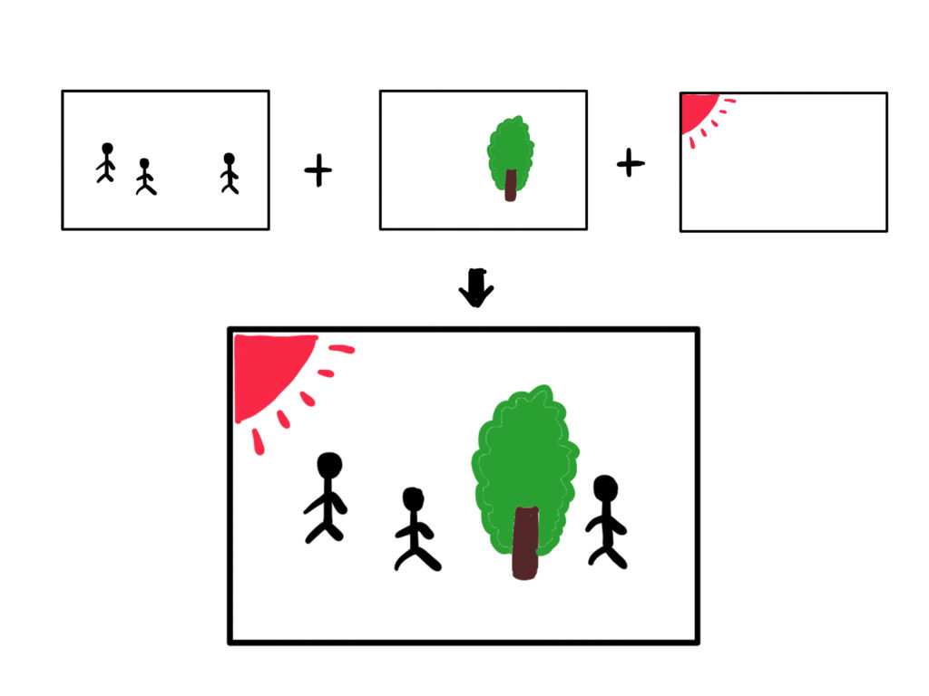 これらを重ね合わせて大きな全体の絵になるという仕組み。