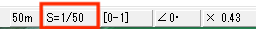 もともと1/50サイズで10mの線を引いた場合、1/100にすると当然画面に表示される10mの線は半分の長さになります。