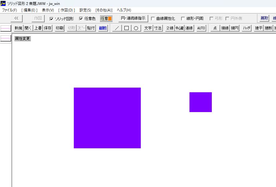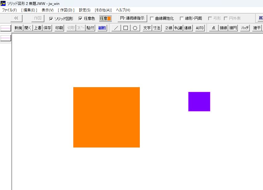 Jw_cadで一度塗りつぶした「ソリッド図形」の色を変更したい時、わざわざ書き直す必要はありません。「任意色」の吸い取り機能を使えば、数クリックで色を置き換えることができます。