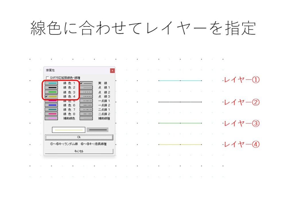 このとき、あらかじめ設定したいレイヤー(例:中心線、寸法、本体など)に振り分けて線を引いておきます。